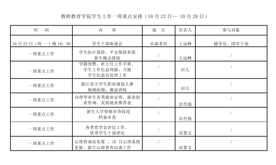 教师湖州师范学院(中校区)教师教育学院下载学生工作一周重点安排(10月22日----10月28日)
