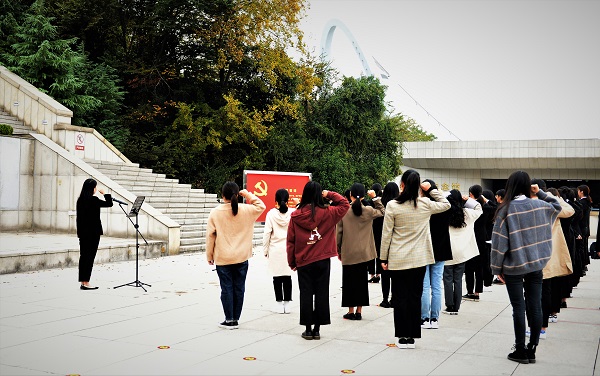 在湖州烈士陵园,全体人员在革命烈士纪念碑前敬献花篮,驻足默哀、鞠躬致敬,追思革命先烈为国捐躯的伟大精神,表达对革命先烈的深切哀思和崇高敬意。学院党委兼职组织员带领党员同志面向鲜艳的党旗重温入党誓词,回顾入党初心。