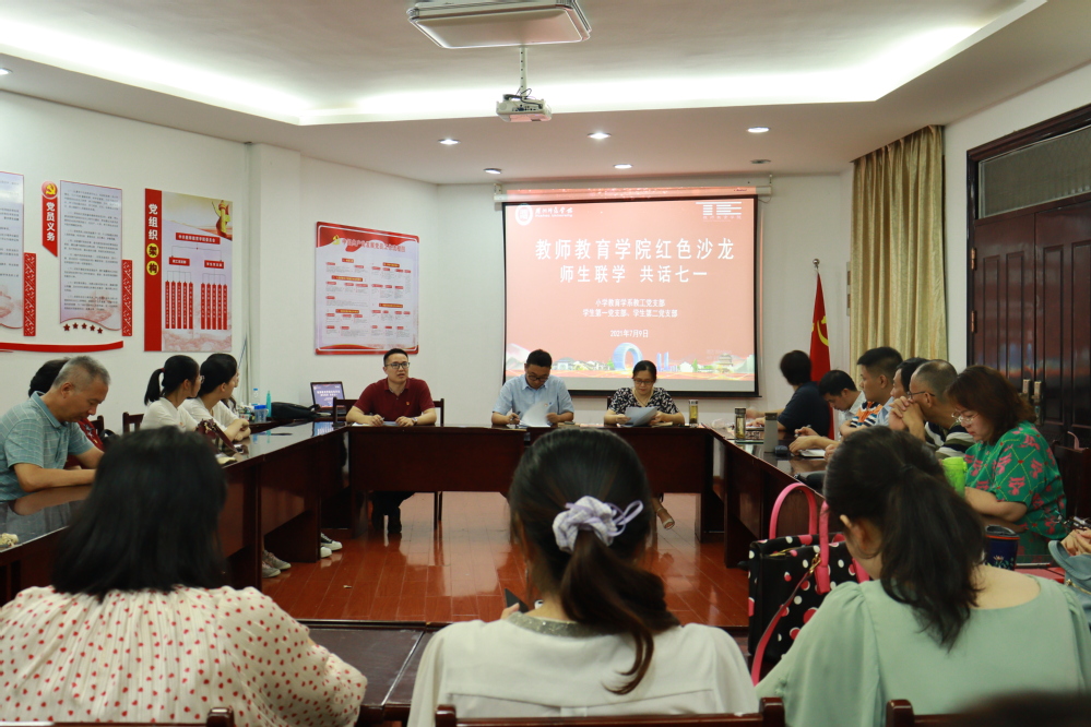 7月9日下午,学院小学教育学系教工党支部与学生第一党支部、学生第二党支部在学院党员之家开展“师生联学·共话七一”党史学习教育联学活动,领悟习近平总书记在庆祝建党100周年大会上的重要讲话精神。师生党支部共计40余人参加本次联学活动。小学教育学系教工党支部书记王燕红主持联学活动。