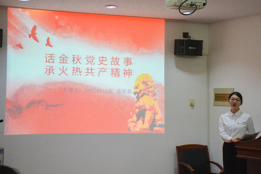 活动中,新生代表们激情昂扬,向与会同志们介绍了个人的党史学习成果,用PPT演绎的方式,展现他们近期研学历史文献、走访红色根据地而得来的红色成果。庆国庆前夕,我院新生青年察时事、践实事、诉真事,一篇篇震撼人心的党史故事娓娓道来。紧接着,学院党建工作负责人老师进行百年教育微党课的讲授并向新生们表示了肯定,她鼓励道,“今日可见同学们的爱党之心、敬党之意,更感受到了你们的专心与用心,希望未来的你们能够勇敢接过党组织的接力棒,继续以党为荣、向党靠拢,不忘初心,牢记使命。”