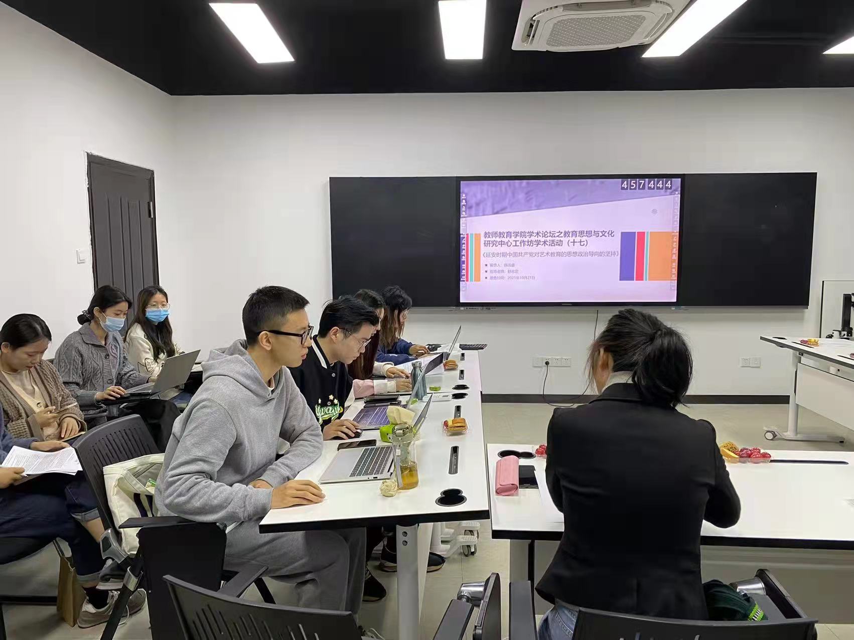 2021年10月21日晚,教育思想与文化研究中心工作坊第十七期学术报告在11-413召开。报告主题是“延安时期中国共产党对艺术教育的思想政治导向的坚持”。中心负责人舒志定老师,中心成员吴凡明、任强、王贤德、王燕红、牛长松老师,2020级、2021级全体教育学原理专业和部分小学教育专业硕士生参加了此次活动。本次活动的汇报人是2020级硕士生陈泓睿,主持人是2020级硕士生周扬刚。