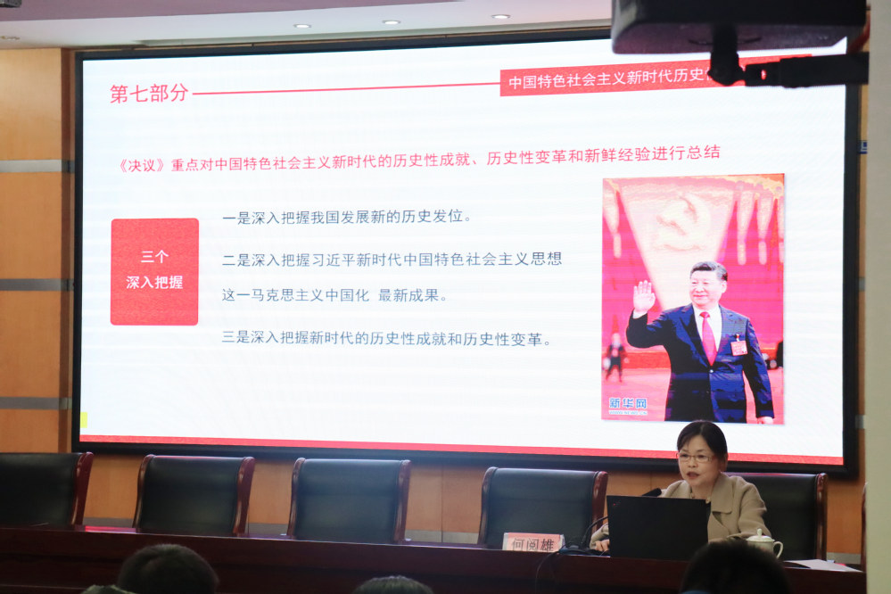 何书记从十九届六中全会召开的背景切入,指出树立中国共产党历史上的五大丰碑,以及全会召开对统一全党思想和行动、在新时代更好开创党和国家事业新局面具有现实意义和深远历史意义。随后,她指出,《决议》的起草工作经过反复推敲,是集中智慧、凝聚共识的体现,并详细介绍了《决议》的组成,总结了党的百年奋斗重大成就和历史经验。同时何书记聚焦中国特色社会主义新时代的历史性成就、历史性变革和新鲜经验进行归纳,展开“三个深入把握”深入把握我国发展新的历史方位,深入把握习近平新时代中国特色社会主义思想这一马克思主义中国化最新成果,深入把握新时代的历史性成就