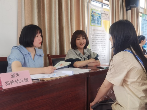 上午,招聘会现场收取报名材料并进行初审。学生进入会场后,根据自身就业意向,向各幼儿园园长递交简历、报名表、教师资格证等相关报名资料,并作简要自我介绍。