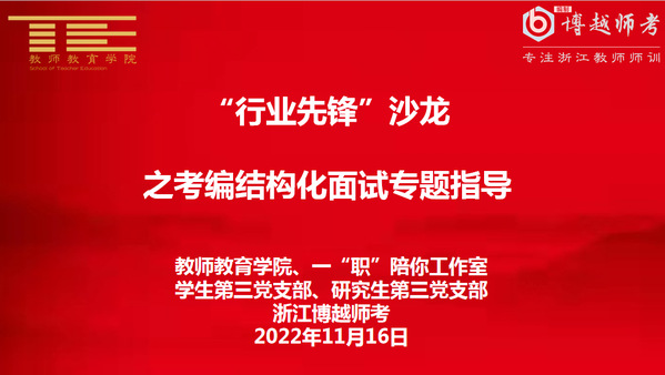 为深入践行党的二十大“科教兴国”战略,促进毕业生就业,2022年11月16日晚18:30,教师湖州师范学院(中校区)教师教育学院下载、一“职”陪你工作室、学生第三党支部和研究生第三党支部于中校区10-512开展“行业先锋”沙龙之考编结构化面试专题指导活动,由学院负责学生就业老师主持,邀请专业指导教师李旎为学生答疑解惑,2023届毕业生通过线上线下形式参加讲座,本次活动由浙江博越师考支持。