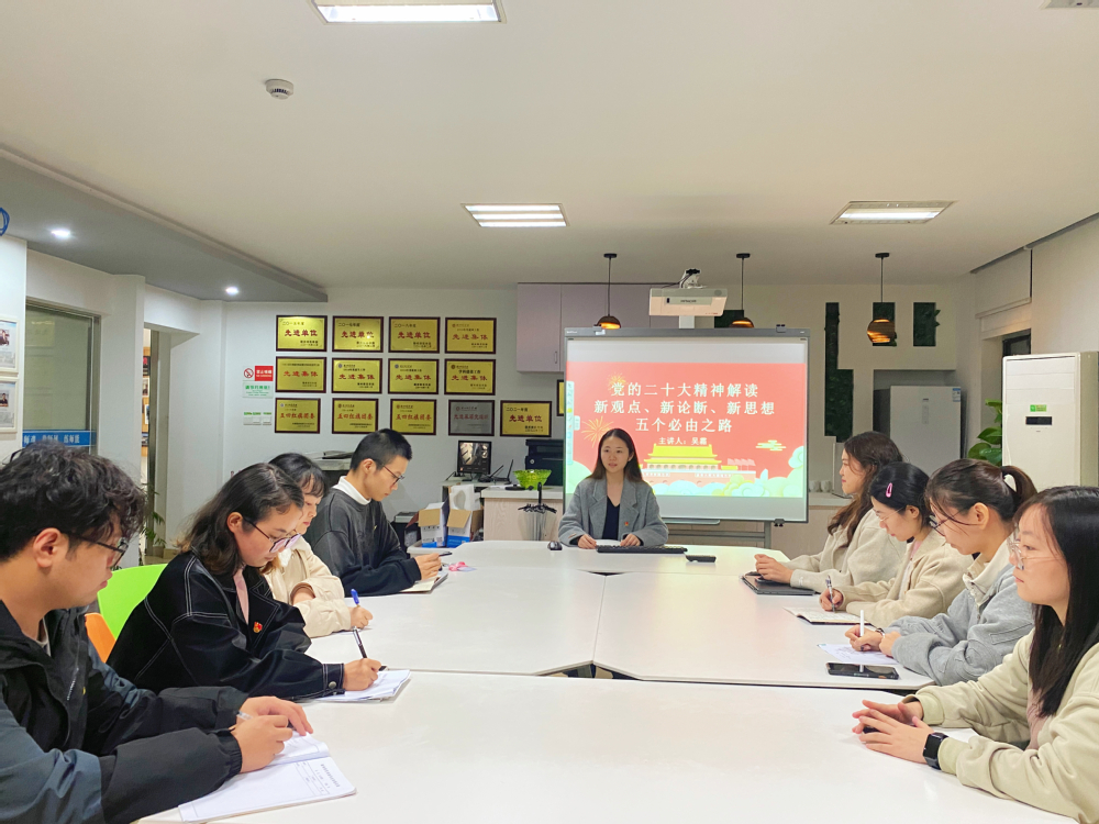 最后,支部书记吴霜开展专题党课并进行活动总结,她以“五个必由之路”为代表解读了党的二十大中新观点、新论断、新思想,号召青年党员要学习党史,从百年党史中领取价值;要坚定理想,从胸怀天下中汲取力量;要勇于实践,从社会熔炉中砥砺前行;要修身立德,从道德情操中提升品格。