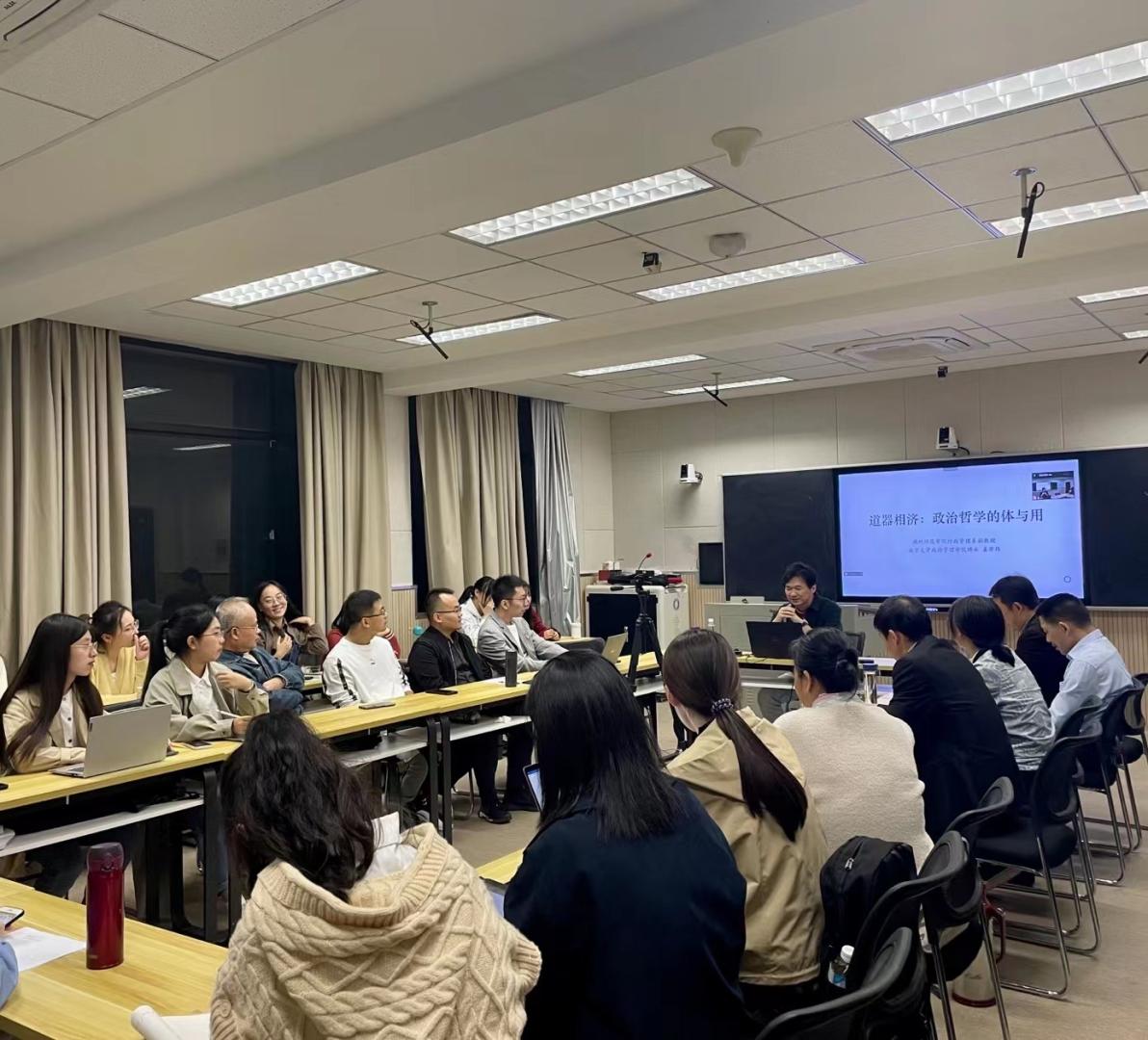 姜亦炜博士以“道器相济:政治哲学的体与用”为主题,一方面,围绕政治哲学的命题:高贵的谎言、最后之人、为承认而斗争、无知之幕、怨恨与资本主义、合法的权威等命题进行具体诠释;另一方面,围绕政治哲学的概念演变,从政治哲学到政治科学、规范研究与实证研究的差异互补等问题进行具体探讨。姜博士在分享过程中将大量的经典原理和个人社会调查进行结合,既直观形象又思想深邃。引起了参会师生的较大共鸣。蔡正道博士从问题的价值性、内容的经典性、方法的合理性、思想的深邃性等层面对姜博士的报告进行了与谈,参会师生也先后就政治哲学研究、乡村教育问题研究等问题与姜博士交换了意见。最后,任强博士对此次报告进行总结,鼓励研究生要立足教育学的学科方向,开拓视野、聚焦问题、钻研方法做学科内的真研究。