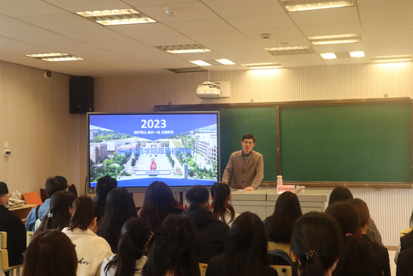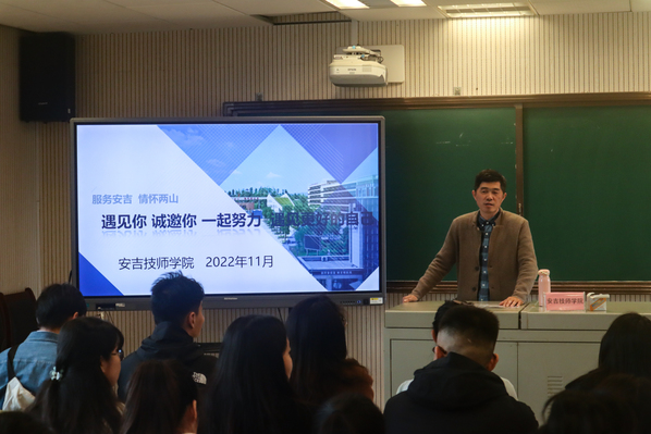 招聘会初始,安吉技师学院组宣人事科科长杜军对该校的校园概况、办学理念、招聘岗位、福利待遇、人才政策等内容进行宣讲,并欢迎各位同学来安吉技师学院开拓“新天地”,成为更好的自己。