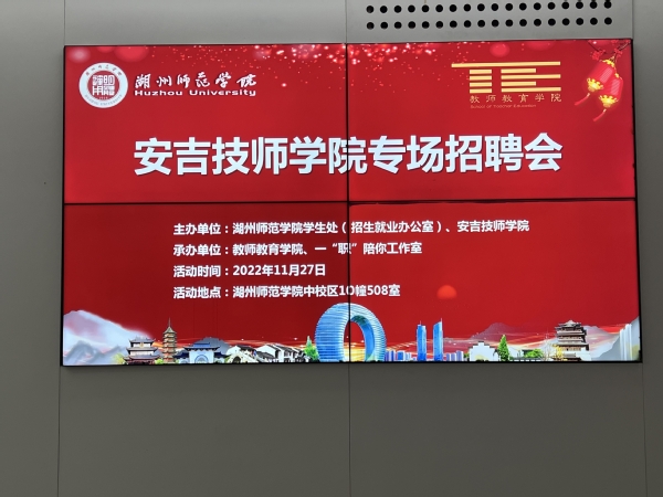 为深入落实“就业优先战略”,优化地方职业教育供给结构,11月27日,教师湖州师范学院(中校区)教师教育学院下载、一“职”陪你工作室于中校区10幢举办安吉技师学院专场招聘会,招聘岗位包括语文、数学、政治、机械、计算机等职业教育事业编制教师。