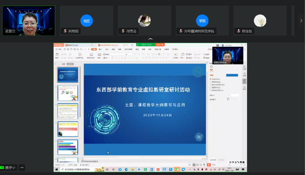 跨越千里,云端相聚,汇集智慧,同心同行。2022年11月29月晚上19:00,由岳慧兰教授主持,湖州师范学院学前系教师、阿克苏湖州师范学院(中校区)教师教育学院下载学前系教师、和田师范专业学校教师们共同参与,开启了东西部学前教育专业虚拟教研室的第一次教研活动。活动以“课程教学大纲的撰写与实施”为主题,邀请了湖州师范学院理学院唐矛宁教授、湖州师范学院学前系主任王云霞副教授做了分享报告,并就教研内容进行现场提问与答疑。