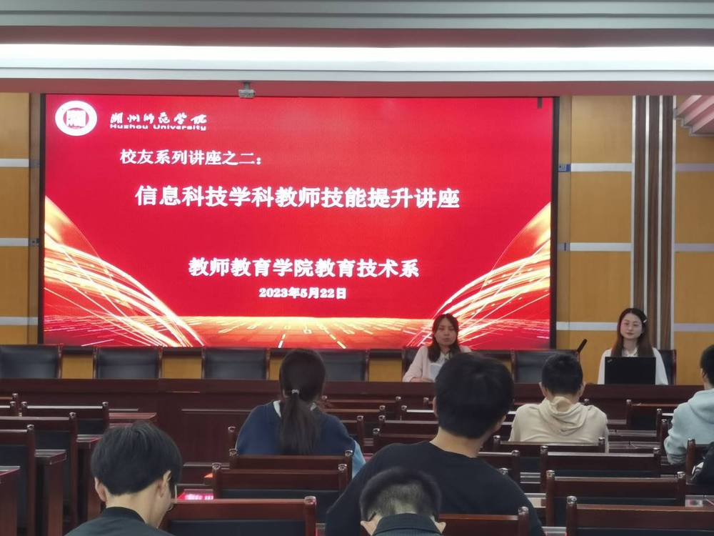 2023年5月22日晚18:00,在湖州师范学院中校区10-512学术报告厅举办校友系列讲座。此次讲座特邀教育技术系校友——金华市外国语实验学校金梦珂老师为本专业学生作了师范生技能提升经验分享。我系相关负责老师出席本次讲座,全体学生参与其中。