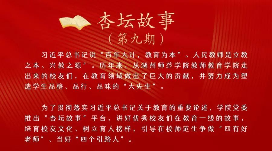 习近平总书记给“国培计划(2014)”北师大贵州研修班参训教师回信中提出,“教师重要,就在于教师的工作是塑造灵魂、塑造生命、塑造人的工作。做好老师要有理想信念、道德情操、扎实学识和仁爱之心。”在湖州师范的学习使我获益匪浅,当年我抱着青涩的梦想进入校门,活跃在拥挤的操场,穿行于拥挤的走廊,聆听着老师的循循善导。母校是我们第一次伸手触及梦想的地方,为我们提供了充实有效的资源,配备了强大的师资力量,谢谢母校赋予我的一切……我想,正是在这样的平凡中,保持着勤奋好学、乐观向上、志存高远的品质,才会为今后的我打下良好的基础。也正因此,我才能将这样的品质发扬光大,才更能全面发展,成为“四有好老师”。
