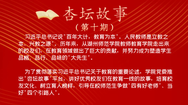 只记耕耘,不为收获。亲爱的同学们,愿你们追求教学之美,生活之美,以美好的心态去拥抱一切;愿你们挖掘、培养自己的学习潜力,自然地进步与转变;愿你们前行路上春雨润物,明德育才,将来教学生涯明朗而有期待。泽流及远,千里思源。湖州师范在我的成长过程中所给予的是无法衡量的价值,这弹丸之地不仅教会了我说普通话,练三笔字,识五线谱,还教会了我真诚善良地做人,刻苦勤勉地工作,不管在什么岗位,不管是什么身份,我一直谨记母校教诲:努力做好自己、完成自己。如今,母校的建设与发展更上一层楼,稳步迈向“湖州师范大学”。十载树林,新苗成才。愿湖州师范积历史之厚蕴,宏图更展,砥砺前进,再创辉煌。