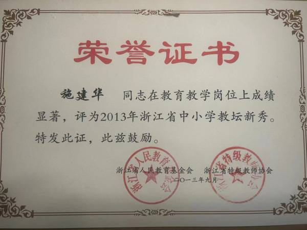 2000年,施建华从湖州师范毕业,正式踏上了教育的事业,当年那个怀揣赤子丹心的少年,在一步一脚印的踏实成长下,收获了许多来自杏坛的认可,已然成为教导有方、勤勤恳恳、堪当大任的一线教师。