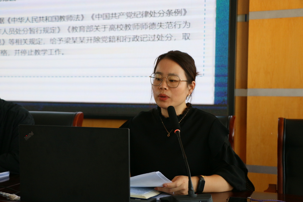 在讲解廉政建设重要性和必要性的同时,沈卫结合《湖州师范学院纪律教育一刻钟》第6期中通报的违反高校教师职业行为十项准则的典型案例,开展了常态化警示教育。最后,她通过“政治上跟党走,经济上莫伸手,作风上解民忧,工作上争上游”的寄语与大家共勉,希望全体教职员工能够深刻认识加强师德师风建设的重要意义,做到知准则、守底线、践行为,将其融入到日常工作、学习和生活中,以实际行动强化法治教育,践行廉洁自律,提升综合素养,持之以恒巩固拓展师德师风建设成效。