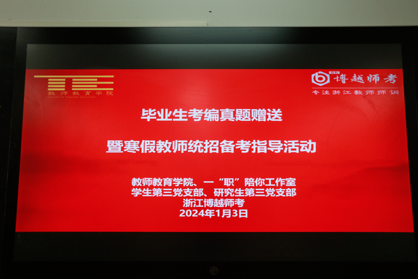 为促进毕业生更快更高质量就业,14下午我院于东校区32103室举办毕业生考编真题赠送暨寒假教师统招备考指导活动。本次活动由教师湖州师范学院(中校区)教师教育学院下载、一陪你工作室举办,学生第三党支部、研究生第三党支部承办,浙江博越师考赞助2024届毕业生参与。