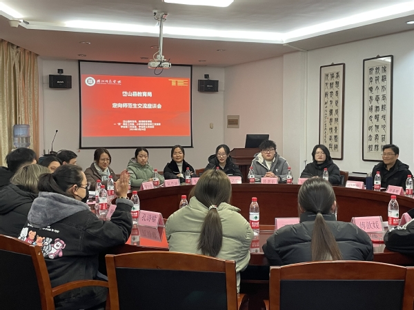 树植我院定向师范生教育情怀培养,加快她们成为基础教育建设骨干力量,228日下午,我院于中校区11-111举办岱山县教育局定向师范生座谈会。岱山县教育局党委副书记翁行波、副局长王琳一行,我院党委委员、小教系主任王燕红、小教系副主任王贤德、就业辅导员陈俊宏,全体岱山县定向师范生参与座谈。