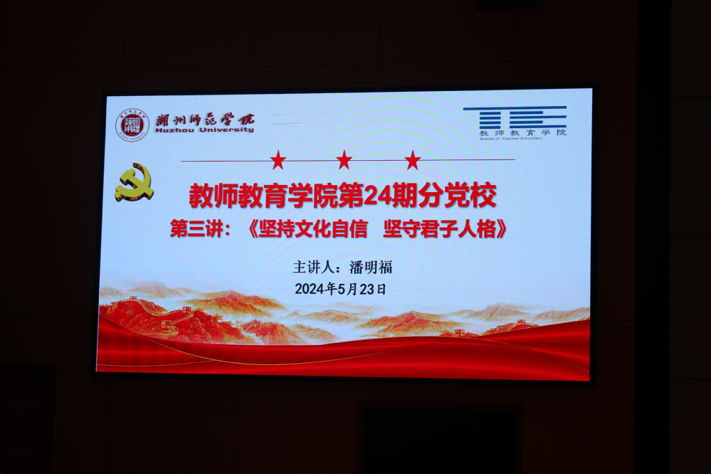习近平总书记在党的二十大报告中提到:要“传承中华优秀传统文化,满足人民日益增长的精神文化需求”,同时要“用社会主义核心价值观铸魂育人”。为了传承和弘扬君子之风,坚定文化自信,5月23日晚,教师湖州师范学院(中校区)教师教育学院下载第24期分党校第三讲以“坚守文化自信,坚守君子人格”为主题,在大学生活动中心顺利开讲。本期党课由湖州师范学院人文学院教授潘明福主讲,分党校全体成员共同参与。