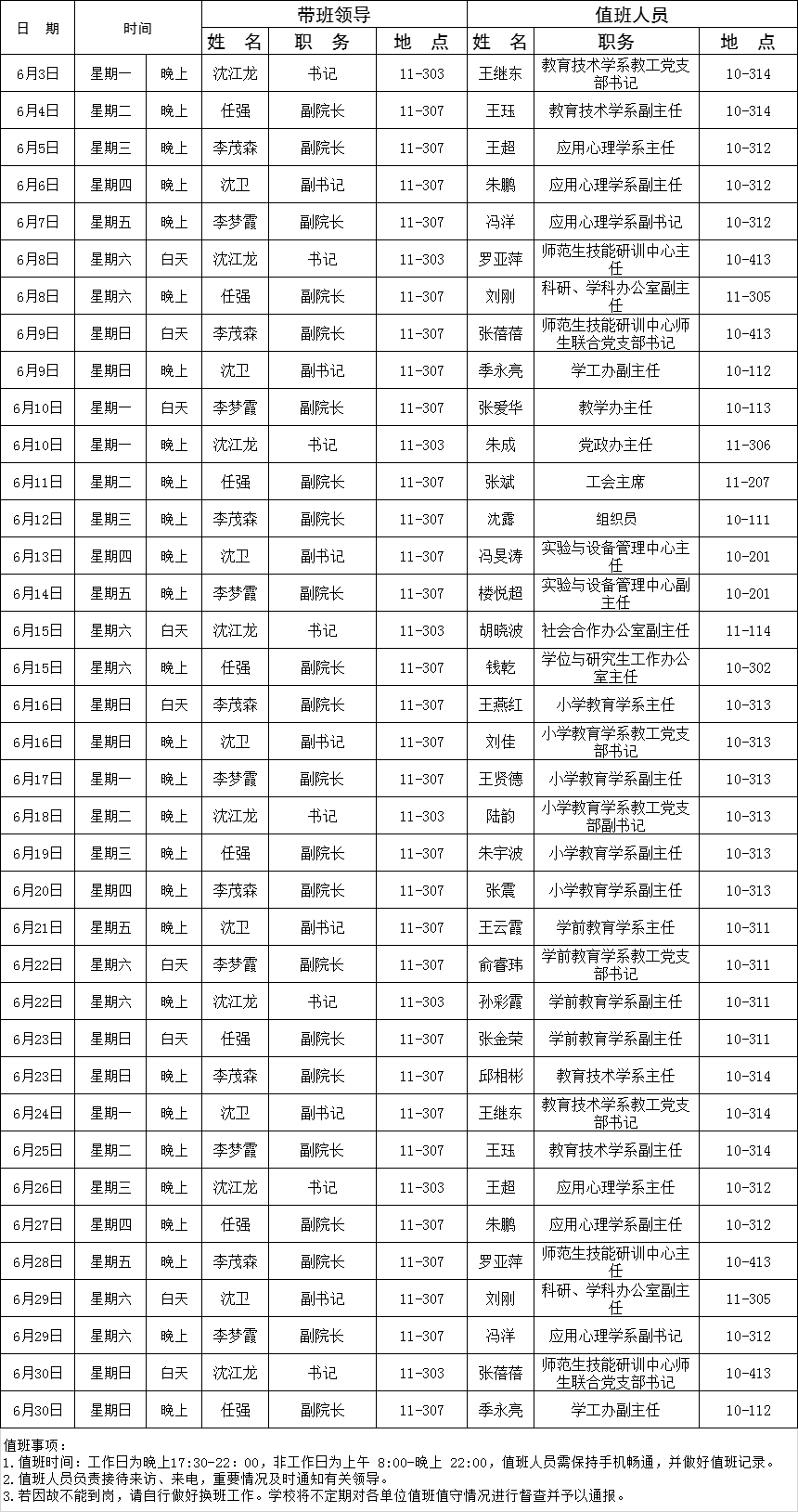 教师湖州师范学院(中校区)教师教育学院下载值班安排表(6月3日—6月30日)