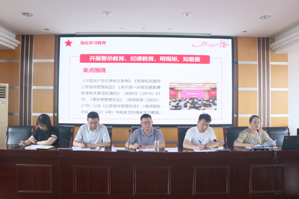 会上,学院纪委书记沈卫同志结合党纪学习教育,组织学习了新修订的《中国共产党纪律处分条例》《党政机关国内公务接待管理规定》《关于进一步规范差旅费管理有关事项的通知》《差旅费管理办法》以及《公务接待管理办法》等。后期,学院将结合学校规章制度严格落实公务接待、差旅报销等重点事项,进一步优化审批流程,规范各类经费管理和使用,并开展常态化纠治违规公务接待、违规吃喝问题工作的日常督察检查。此外,沈卫同志还结合二级纪检监察机构履职监督月报,多层面监督杜绝违纪违法现象发生。