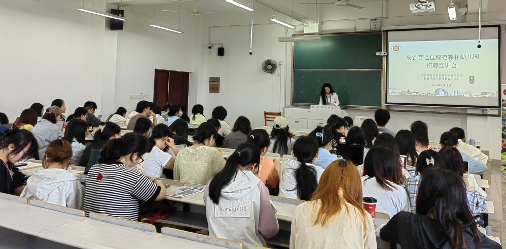 4月11日上午,湖州师范学院(中校区)教师教育学院下载在东校区32-419举办安吉百之佳博苑森林幼儿园专场招聘宣讲会,学前教育专业140余名学生参加,北京博苑教育集团人事负责人王宁到场做招聘宣讲。