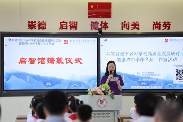 上午,与会人员首先参观了崇福实验小学启智馆,了解学校“运河文化”的办学特色,感受“德润童年 智趣人生”的办学理念。崇福实验小学开发了独具特色的“智趣课程”,致力于通过各教学项目的有序开展培育新时代“崇德、启智、健体、向美、尚劳”五育并举的运河好少年。刘佳博士与崇福镇领导共同为启智馆揭牌。