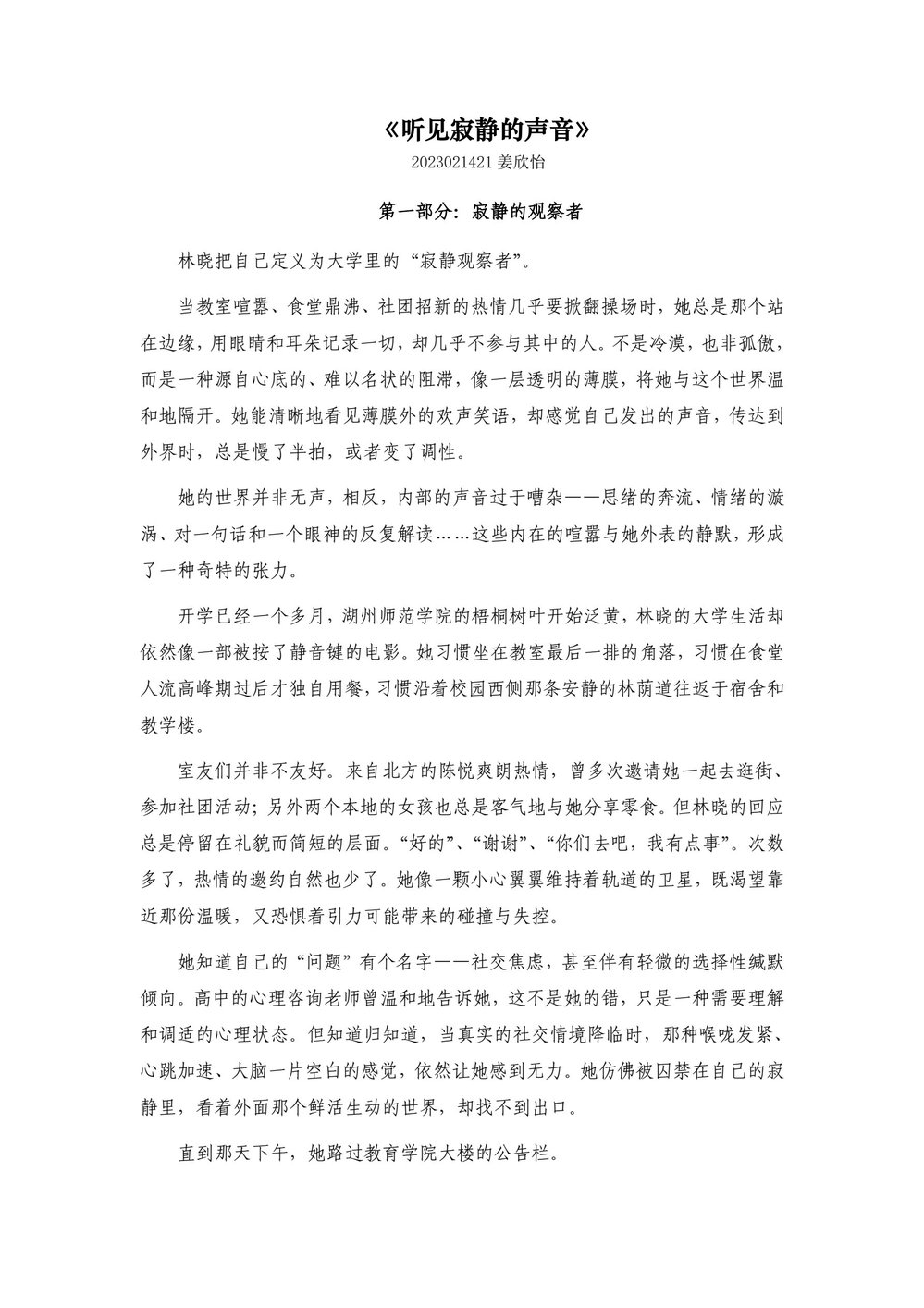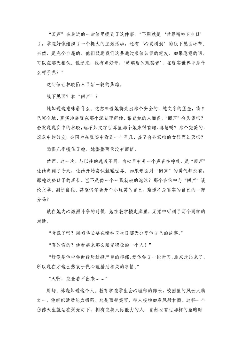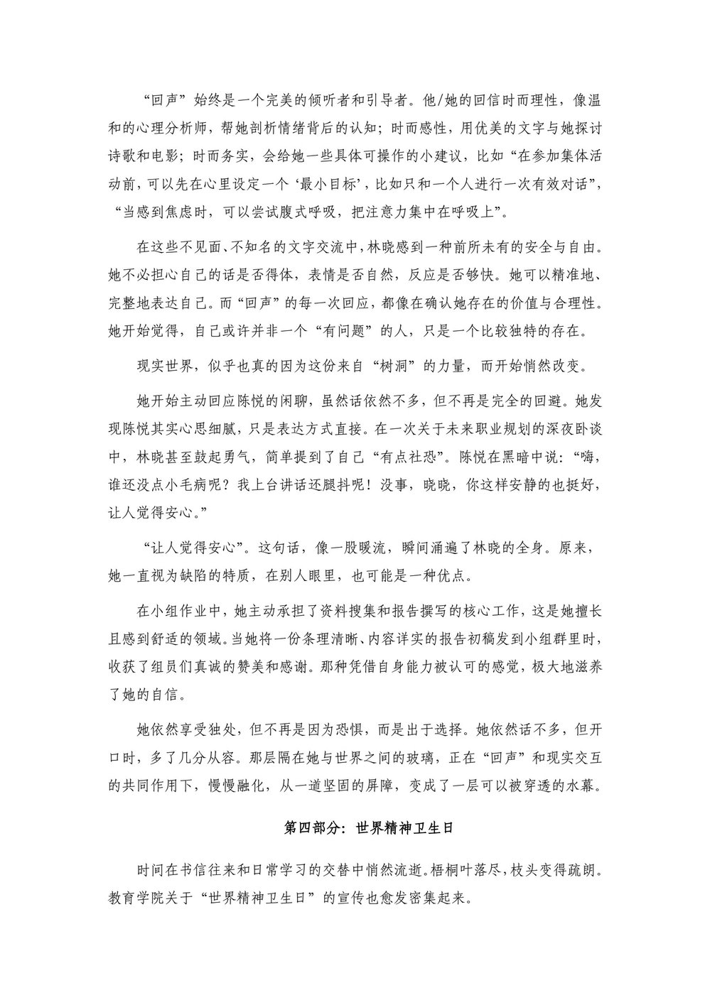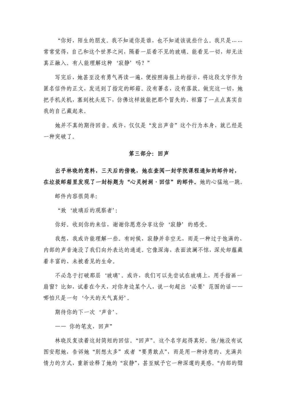 “心灵微光”微小说创作则以文字为媒介,承载成长中的感动与思考。同学们将那些关于陪伴、困境与突破的珍贵瞬间,凝练成一行行触动人心的句子。这些作品不仅展现了脆弱中的坚韧,更在字里行间传递出温暖与力量。