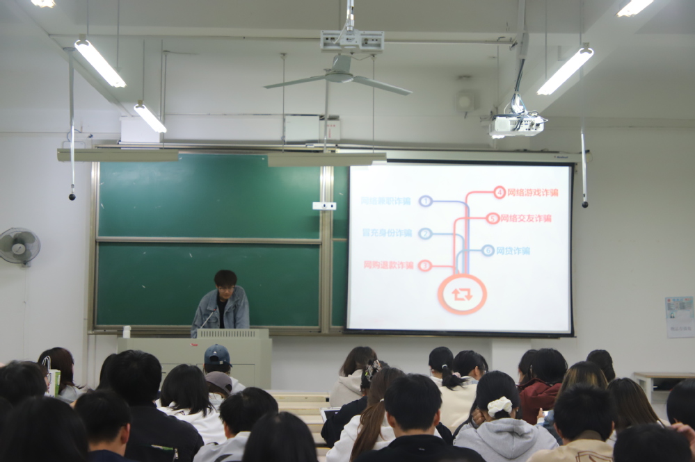 在具体宣讲环节,各模块内容聚焦痛点、精准发力。防诈骗板块,宣讲团重点解读网络兼职、冒充身份、网购退款等常见骗局,通过刷单诈骗视频、“同学受伤住院”案例揭露作案手法;同时提醒,微信或QQ借钱需电话/当面确认,牢记反诈专线96110,强调个人征信由中国人民银行统一管理,无人有权删改,警惕相关诈骗话术。防偷盗环节,结合校园场景,指出食堂用包占座、电动车随意停放等隐患行为,现场示范正确锁车方式,叮嘱贵重物品随身携带,养成离车即上锁习惯。消防安全板块,详解灭火器部件,以视频演示使用步骤,讲解报警流程,特别强调取货后需拨打校园报警电话2321110,并列举防火注意事项。禁毒安全部分,系统讲解毒品定义、危害及防毒拒毒方法,通过真实案例与图片展示强化新生意识。此外,宣讲团还推荐“平安湖师院”微信公众号,鼓励学生关注校园安全动态、主动学习安全知识。