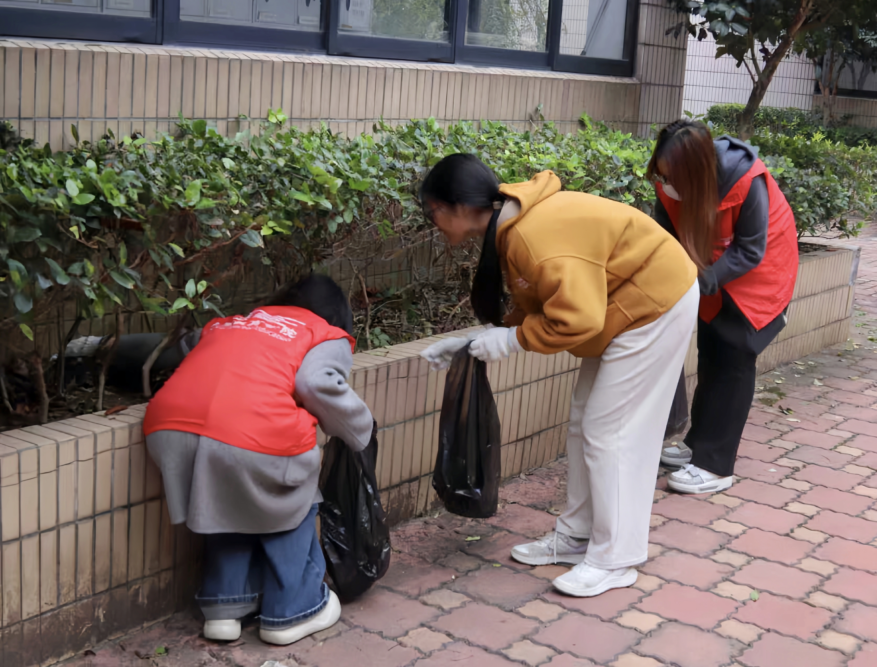 活动中,全体参与者统一着装,精神抖擞,按照预先规划的区域与分工,有序开展“地毯式”环境清理。大家配合默契,细致捡拾杂物、清理枯枝,不放过任何一个卫生死角。尽管天气微凉,但每一位志愿者都干劲十足,弯腰拾起的不仅是垃圾,更是对校园的深情与对责任的坚守。经过数小时的辛勤劳动,花坛、停车棚、绿化带等区域面貌焕然一新,校园环境更加整洁优美。