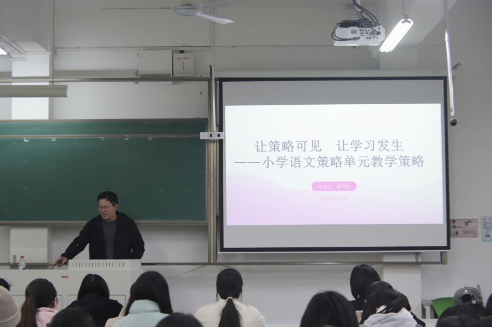 11月20日下午,湖州师范学院(中校区)教师教育学院下载“大先生”讲堂(十)在31-115教室开讲,本期讲堂特邀湖州市月河小学校长、高级教师施国强为主讲嘉宾,为2023级小学教育(语文方向)学生作“小学语文阅读策略单元教学指导”专题讲座。小学教育专业负责人马利云主持活动。